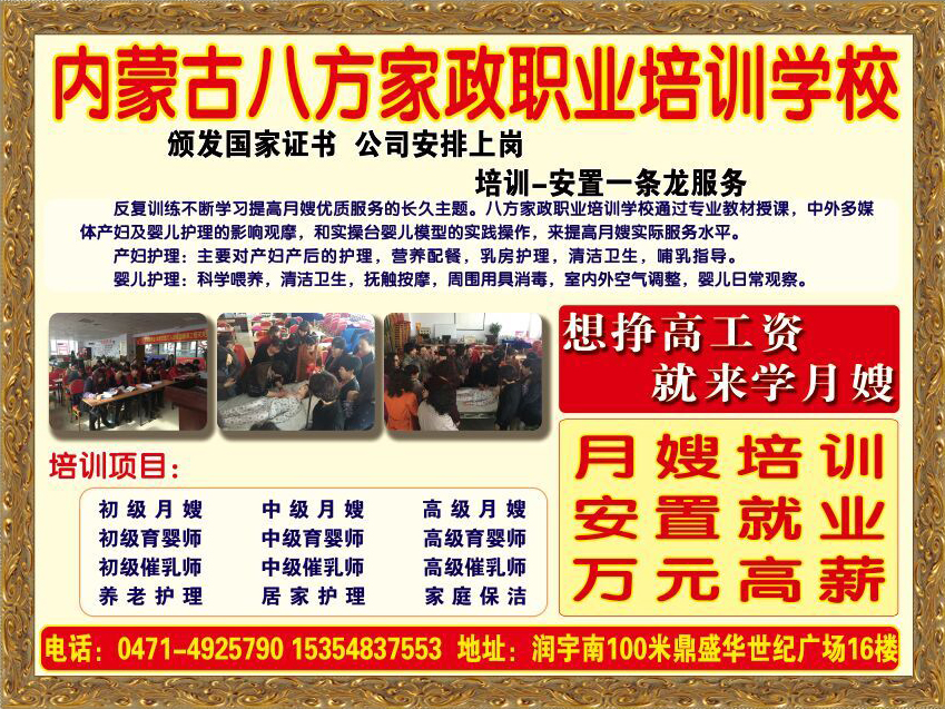 提高家政業(yè)的服務(wù)質(zhì)量,使家政服務(wù)人員技能化規(guī)范化服務(wù),是我國家政業(yè)發(fā)展二十多年后面臨的首要課題。內(nèi)蒙古八方家政職業(yè)培訓(xùn)學(xué)校就是順應(yīng)這一家政業(yè)發(fā)展需求而應(yīng)運(yùn)而生的。內(nèi)蒙古入方家政職業(yè)培訓(xùn)學(xué)校成立于2011年的6月,是經(jīng)自治區(qū)民政廳和人社廳核準(zhǔn)的、國家認(rèn)可具備辦學(xué)資格的家政職業(yè)培訓(xùn)學(xué)校。業(yè)務(wù)范圍包括:培養(yǎng)培訓(xùn)各類家政人員;保姆、月嫂、保潔、護(hù)理及家庭服務(wù)業(yè)所需人員。內(nèi)蒙古八方家政學(xué)校設(shè)在內(nèi)蒙古八方保姆有限責(zé)任公司的總部;呼和浩特市新城區(qū)興安北路鼎盛華世紀(jì)廣場16層,占地面積將近750平米。授課教室寬敞明亮,兩處,可容納100名學(xué)員同時聽課;教學(xué)設(shè)施現(xiàn)代化,配備了電腦、投影儀、顯示幕布、打印機(jī)、為培訓(xùn)老人護(hù)理員,購買了輪椅,吸氧機(jī)等家庭護(hù)理設(shè)施;培訓(xùn)教材豐富多樣,育嬰師、月嫂、老人護(hù)理、家庭保潔等內(nèi)容的培訓(xùn)光碟以及自己制作的課件足以滿足各種類型的家政培訓(xùn)。